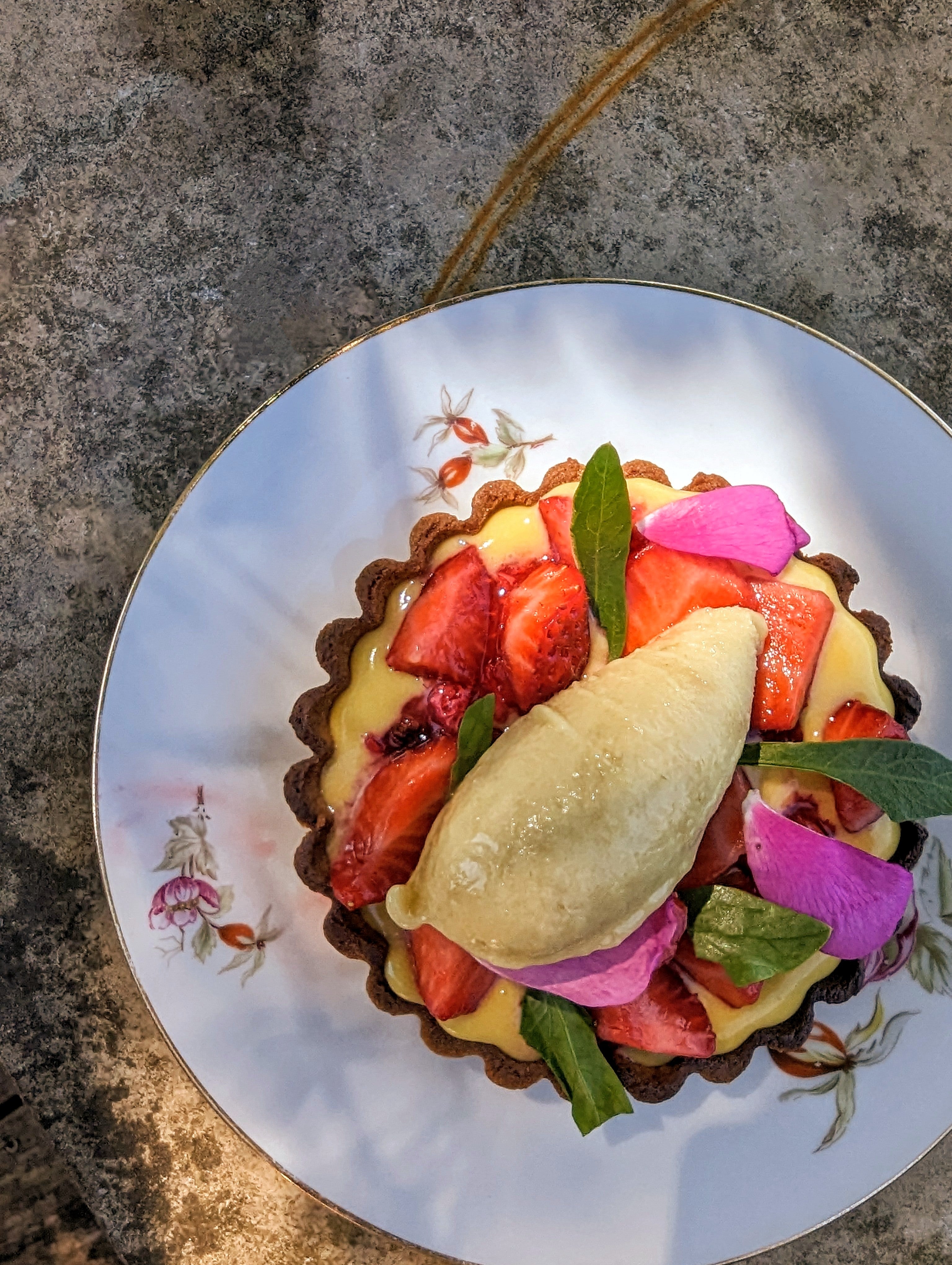 I de gamla djurstallarna har vi vår restaurang med plats för 40 gäster och har en härlig uteplats med utsikt över hagarna där fåren betar. Vi har stora rejäla bord som vi brukar dela med flera sällskap för att skapa intressanta möten. I somras körde vi tre veckors sommarkrog med sex rätters fast meny med enbart råvaror från gården. Under 2025 är planen att gå tillbaka till ett mindre format vi kallar 16x6, sexton gäster och sex rätter i en liten och personlig upplevelse.
