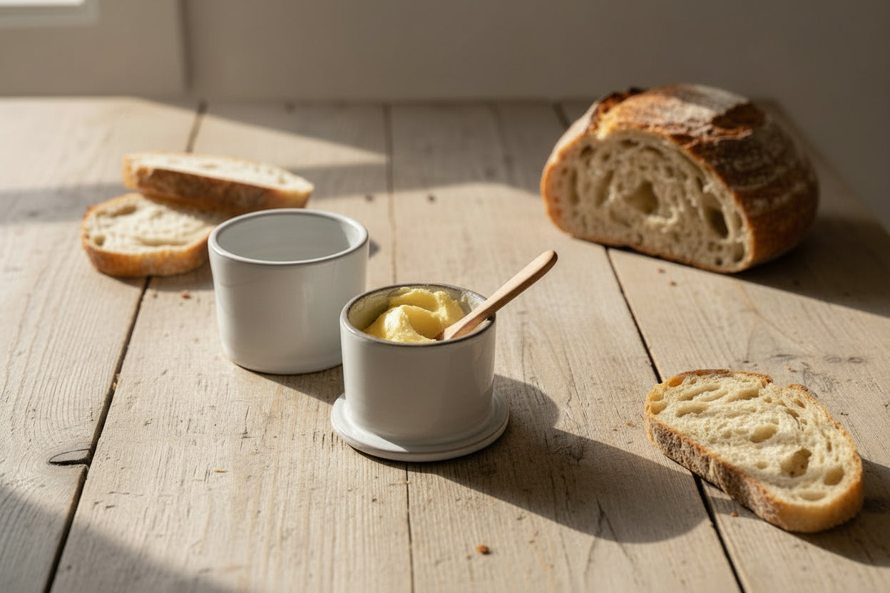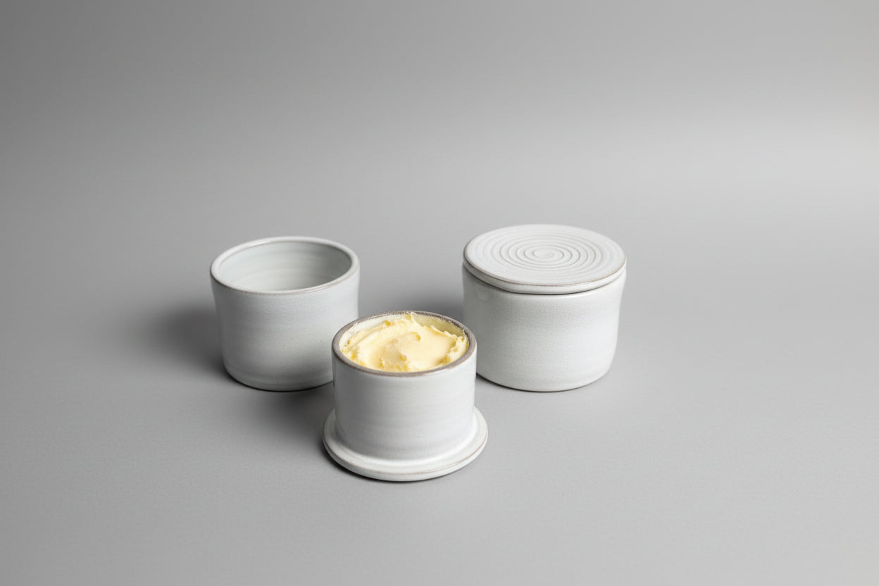 Inspirerad av den nordiska kylan och det lugn som infinner sig vid dagens första mål. Arctic Ritual är en handgjord smörklocka som förenar uråldrig teknik med modern estetik. Genom att använda vatten som naturlig tätning håller den smöret mjukt och färskt på köksbänken, helt utan kylskåp.